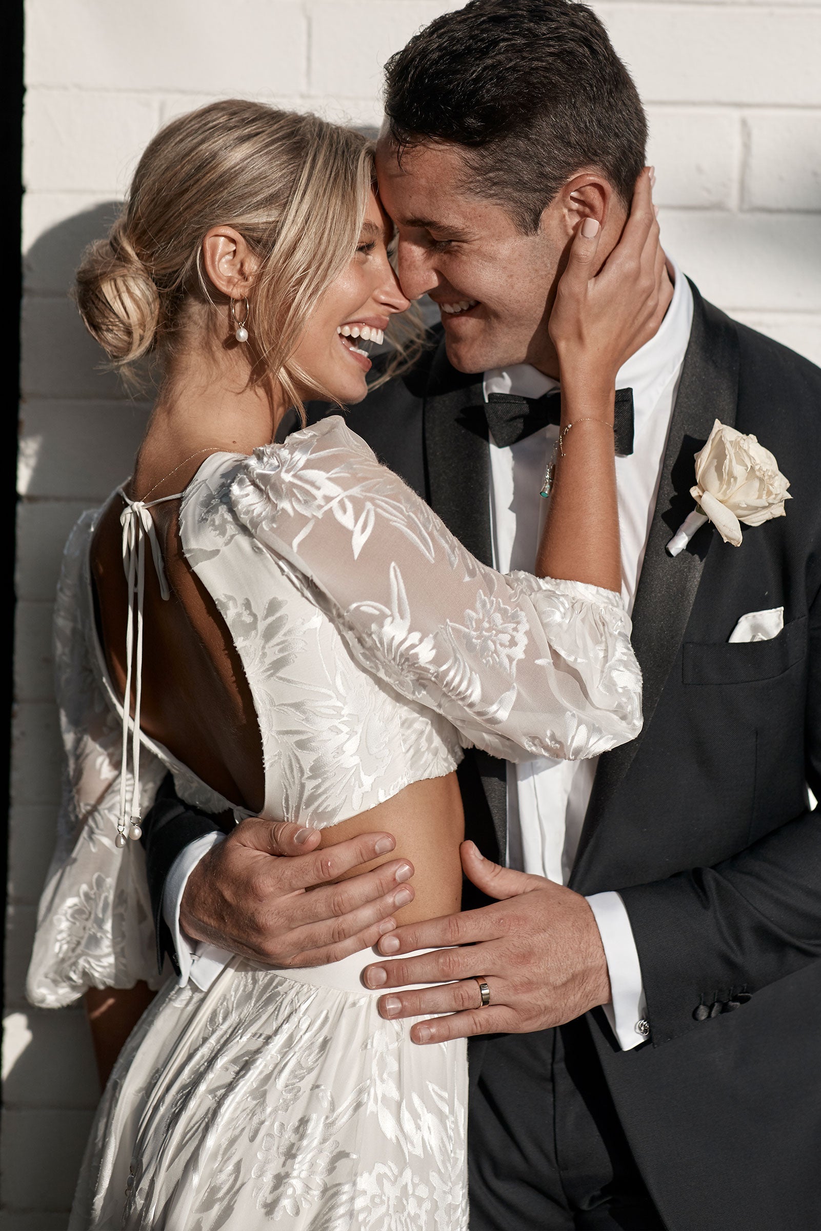 This two-piece wedding dress features a full circle skirt detailed with a crepe de chine waistband that accentuates the waistline and radiates with movement.