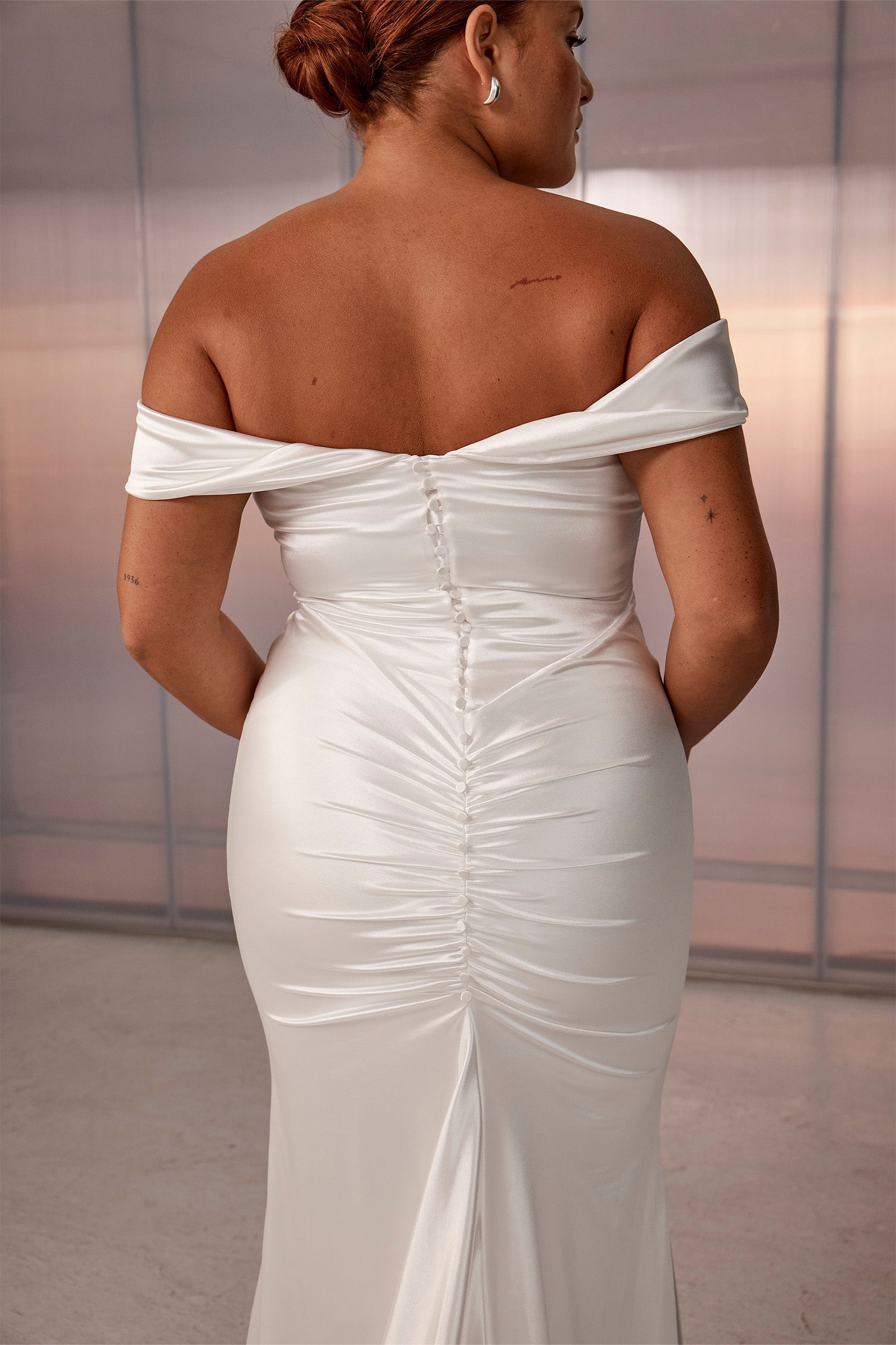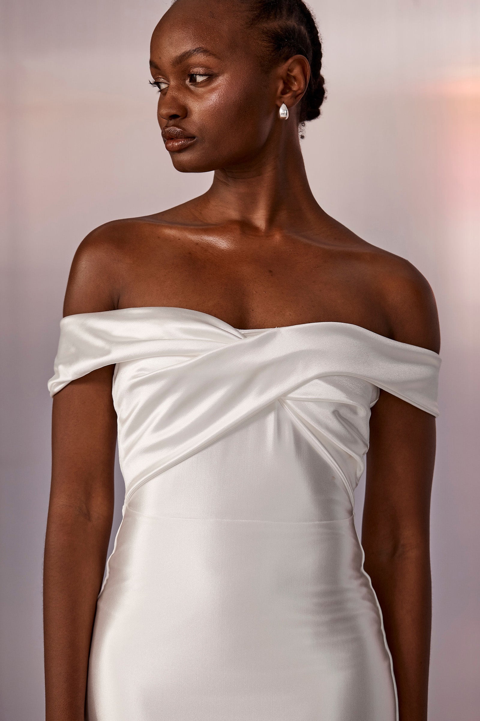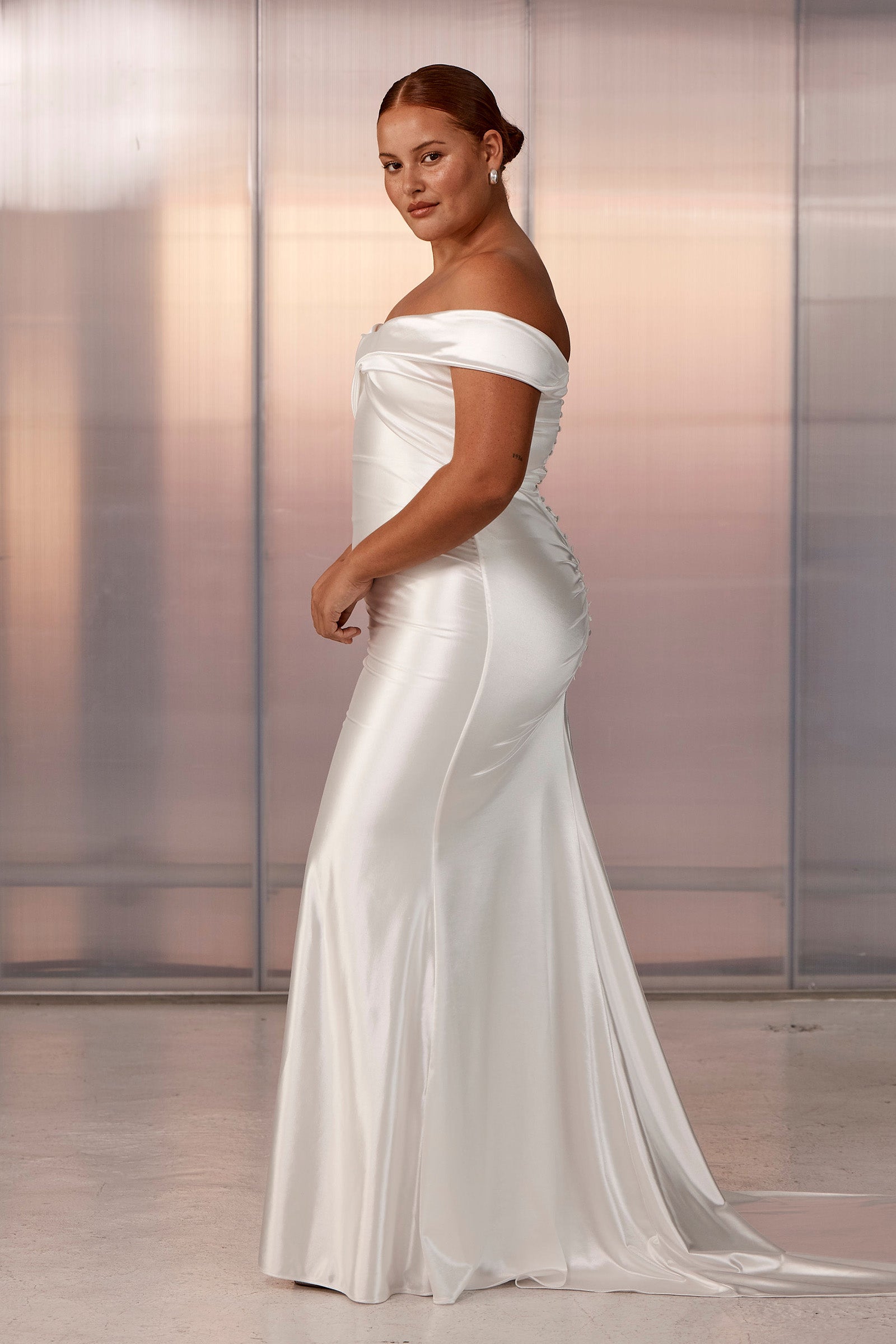 Old Hollywood glamour is brought to life with Cupid. Designed in a pearlescent stretch satin, this luminescent gown gives lustre and dimension while maintaining the comfort and agility our gowns are known for.