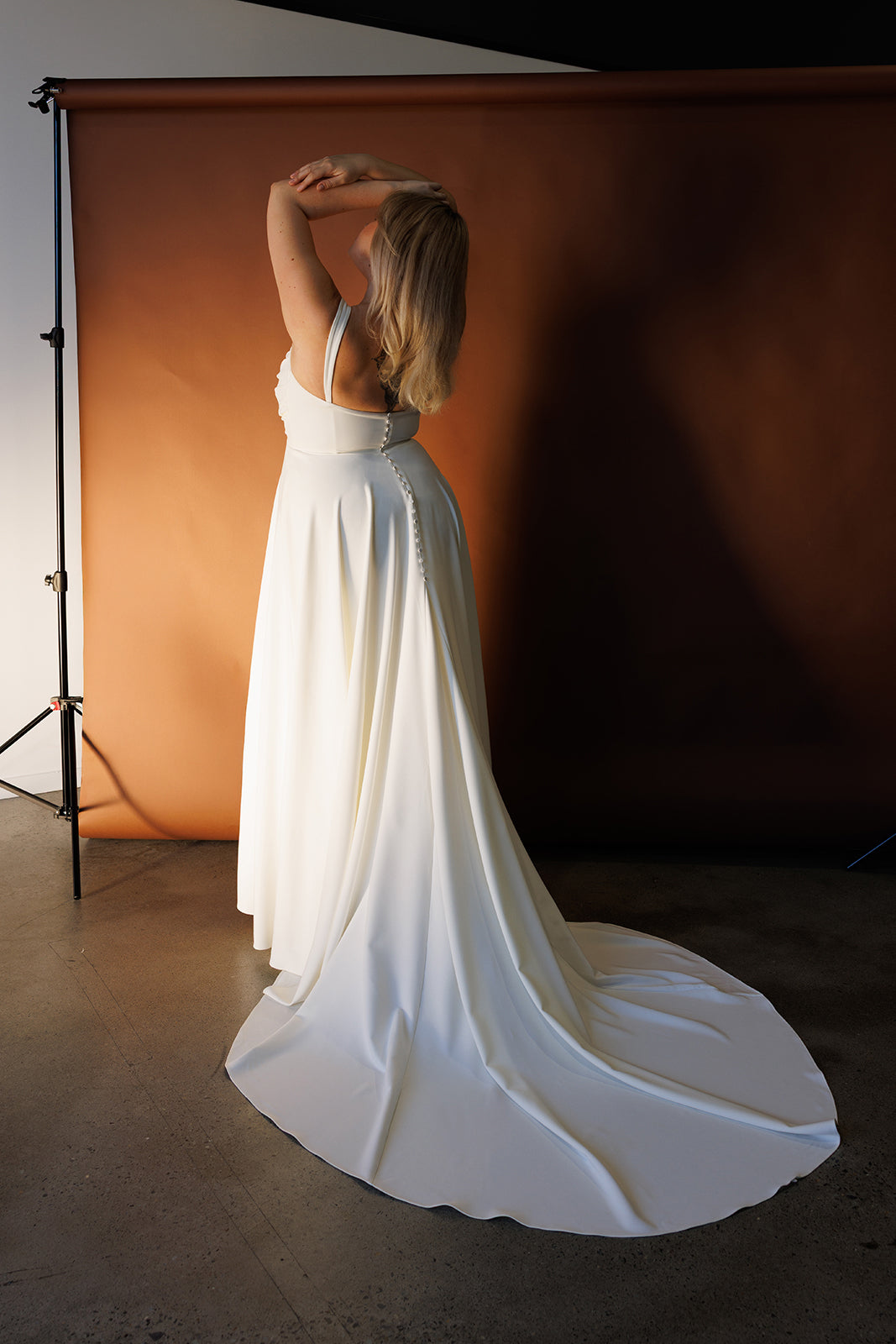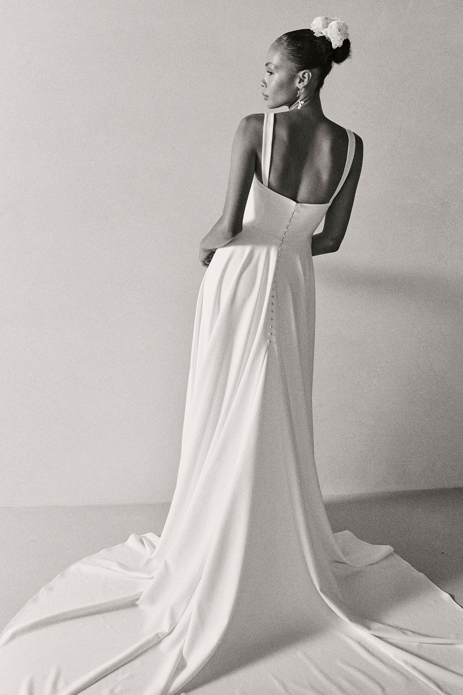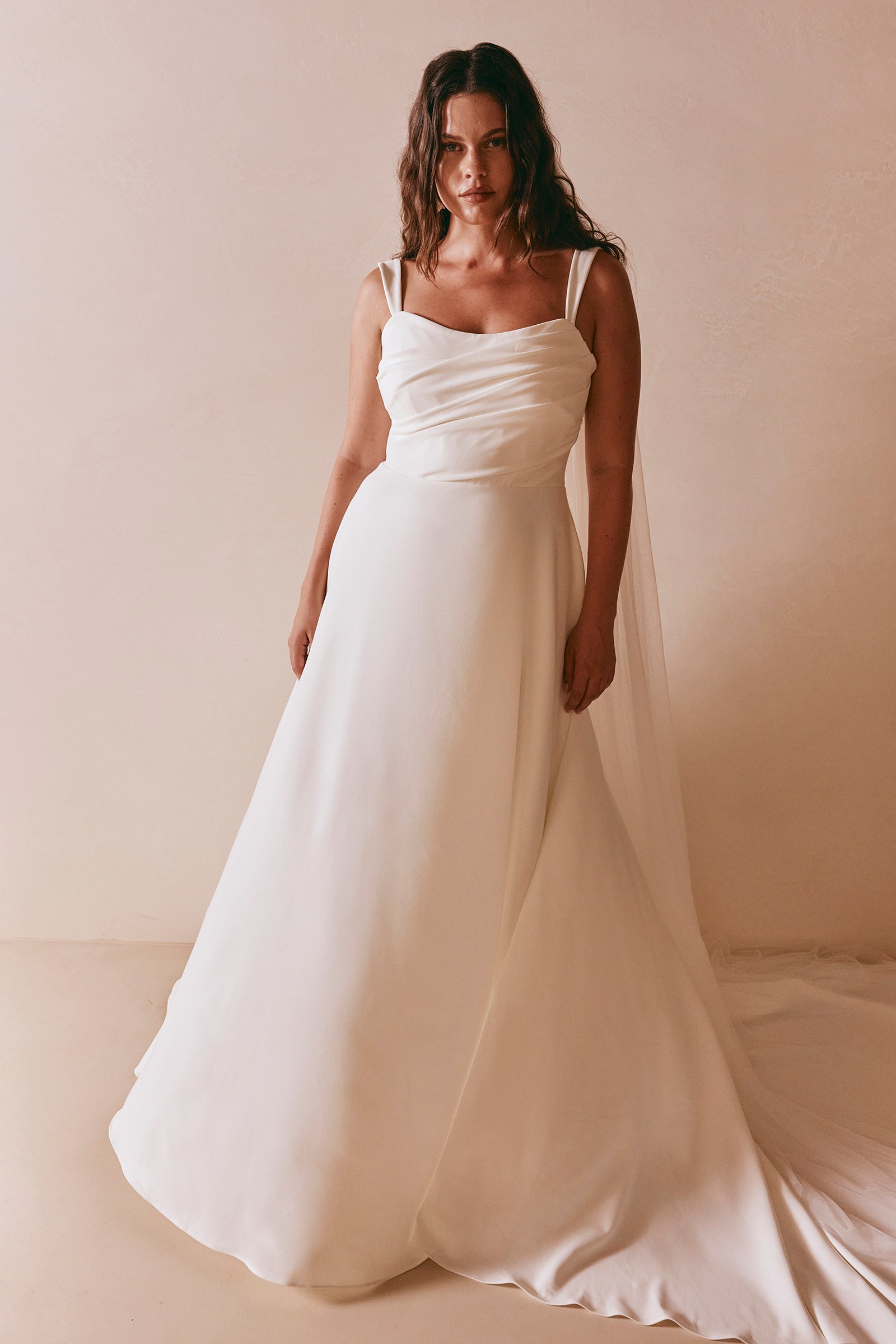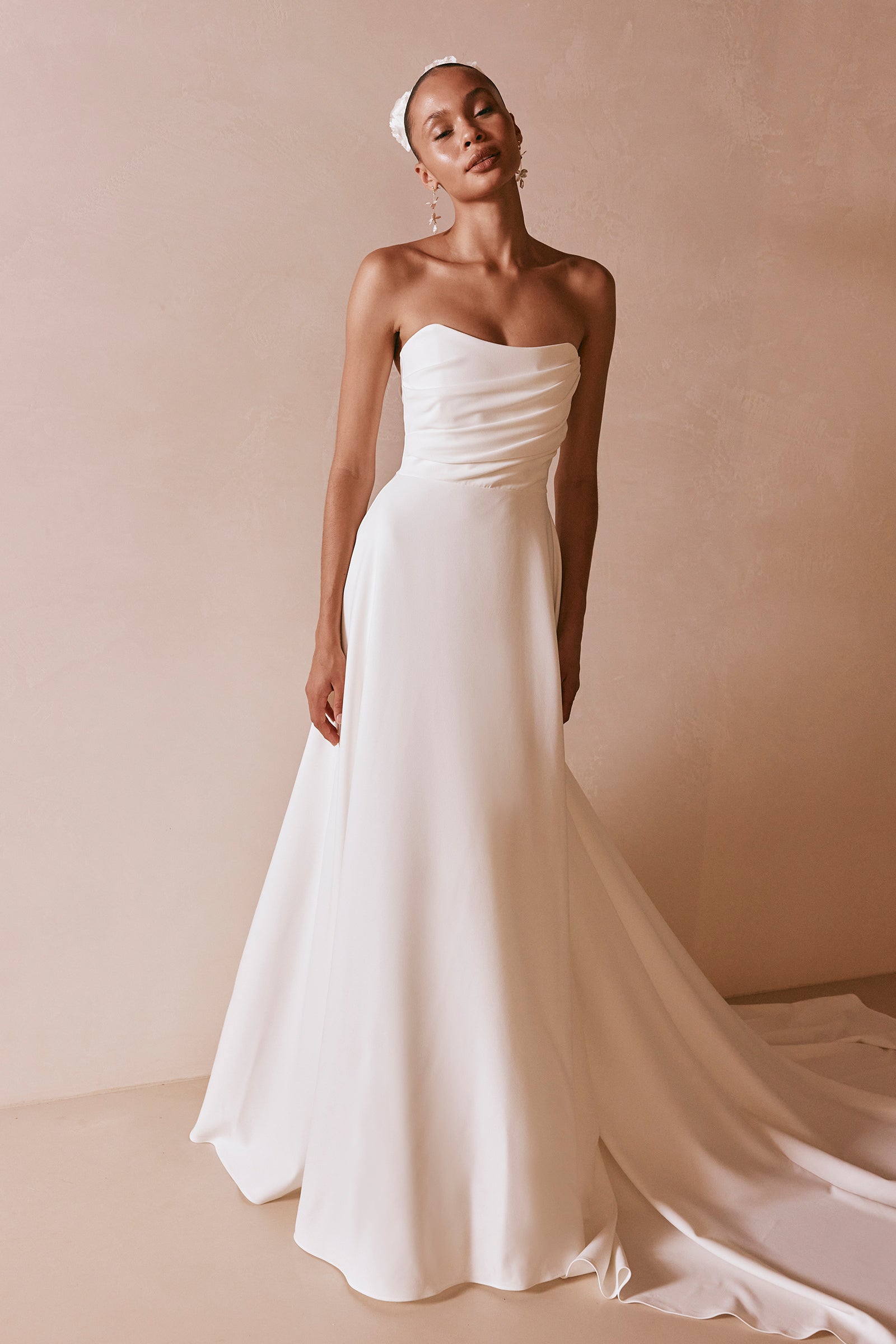 A classic silhouette for the modern era. Emma is defined by her dramatic A-line skirt, crafted to flatter every figure. Made from stretch crepe and adorned with hand-draped pleats, this wedding dress features a strapless neckline complimented by detachable wide straps for versatile styling.