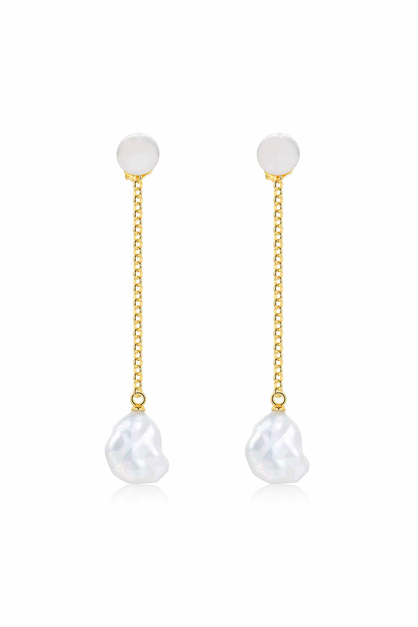 The Felipa Earrings, inspired by life under the sea. The 5.5cm drops feature a single freshwater pearl complete with a dangling Keshi pearl. Highly versatile, these earrings can be worn as a stud with a removable drop chain.