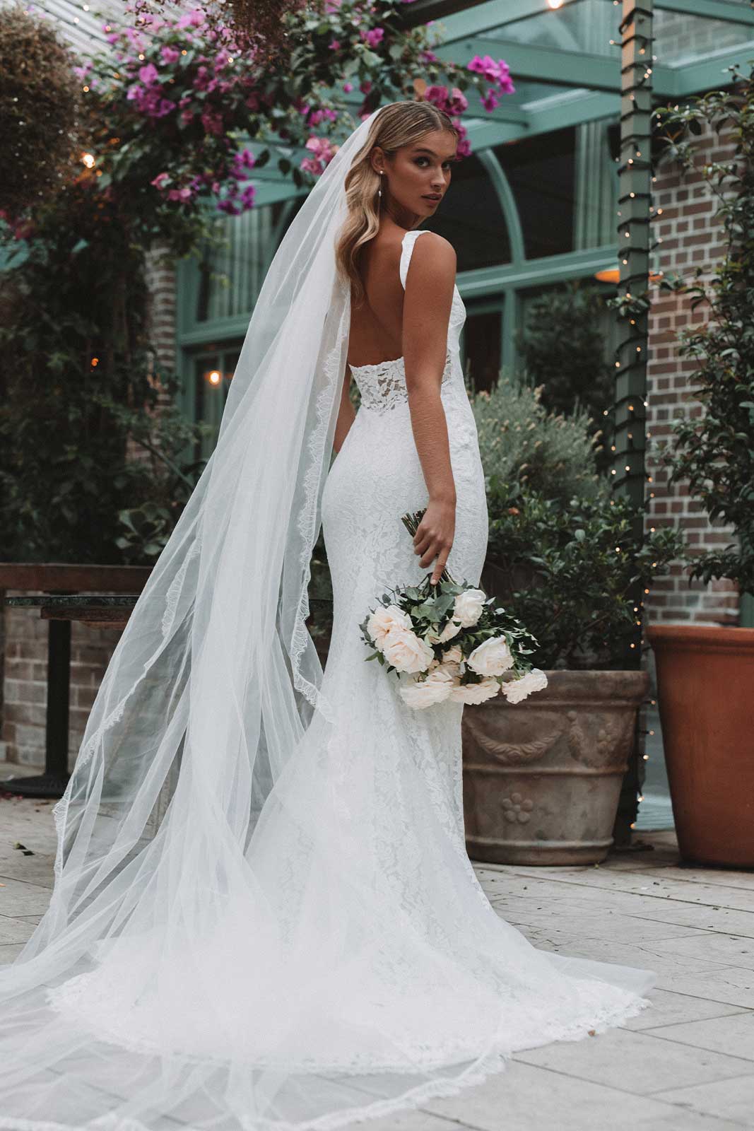 This ultra-feminine lace wedding dress features a plunging neckline and high split, blending style with sustainable design.