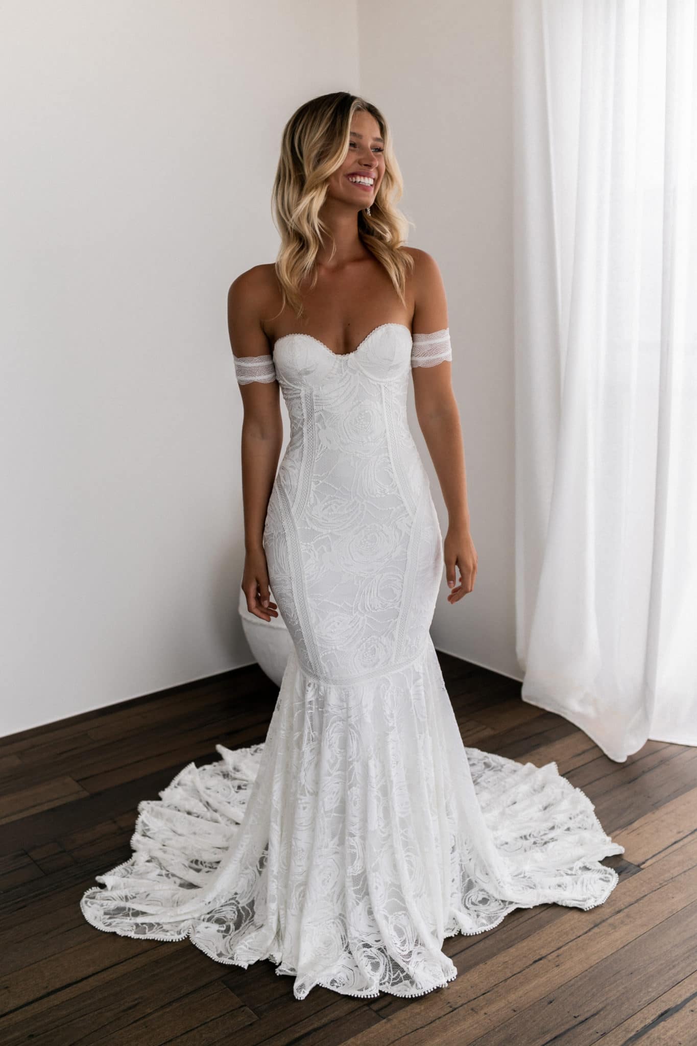 An innovative off-the-shoulder lace wedding dress that has been tried and tested, Palm empowers you with a one-of-a-kind finish.