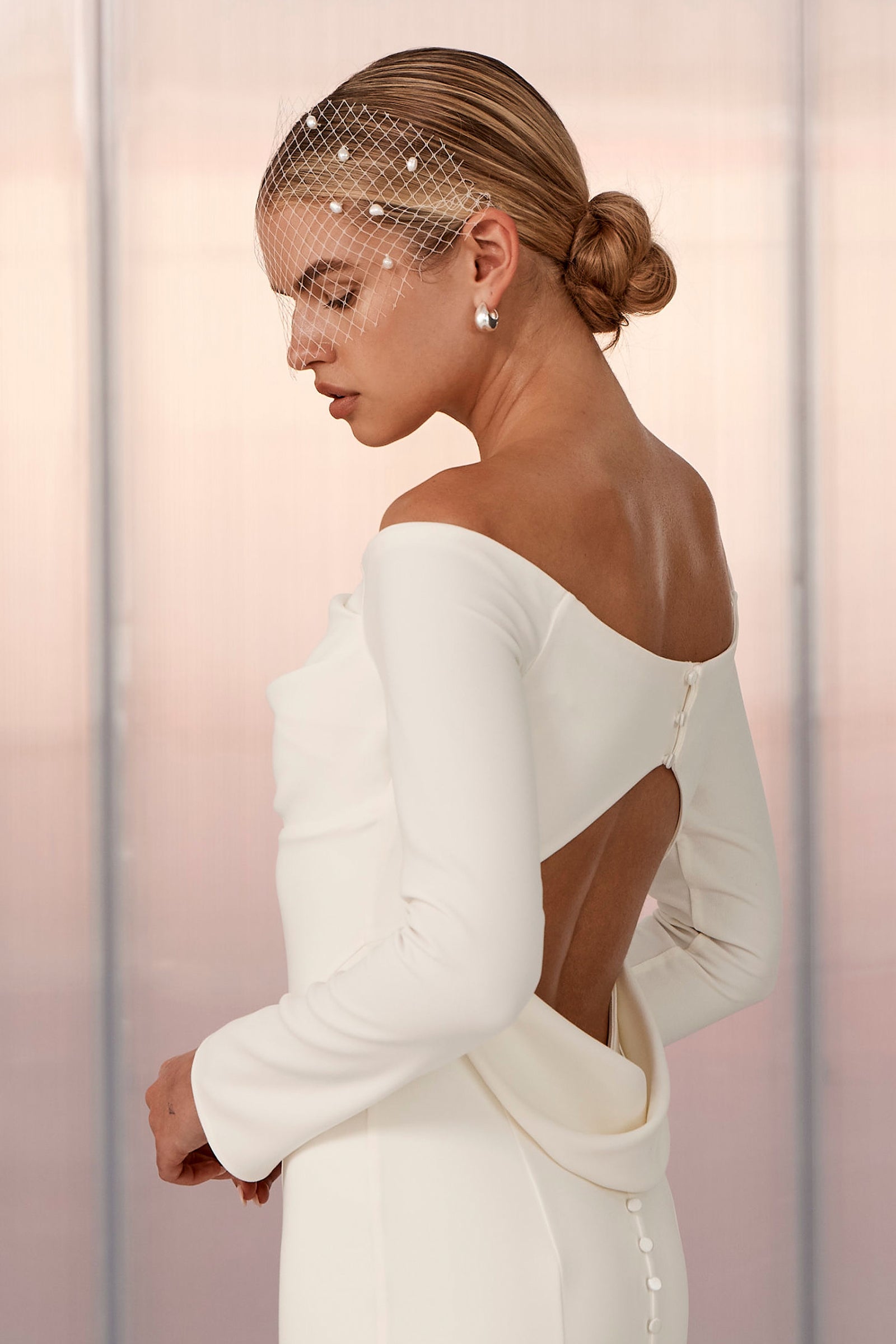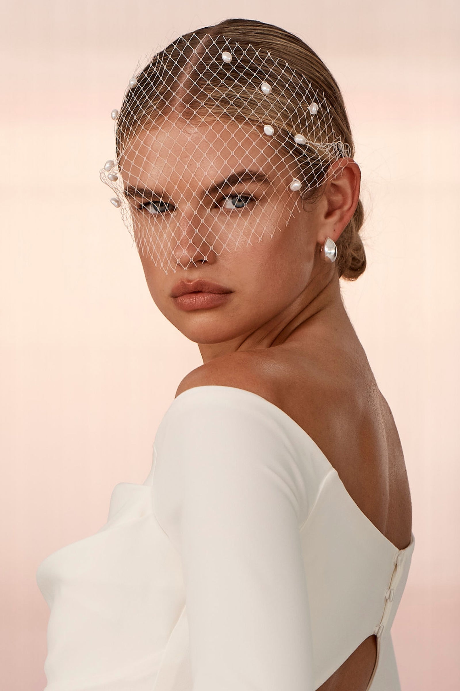 Inspired by 1940's styling, the Pippa Facinator is for the sophisticated and classic bride. Styled with our Grace gowns, our tulle birdcage veil embodies a timeless bridal look elevated through pearl accents.