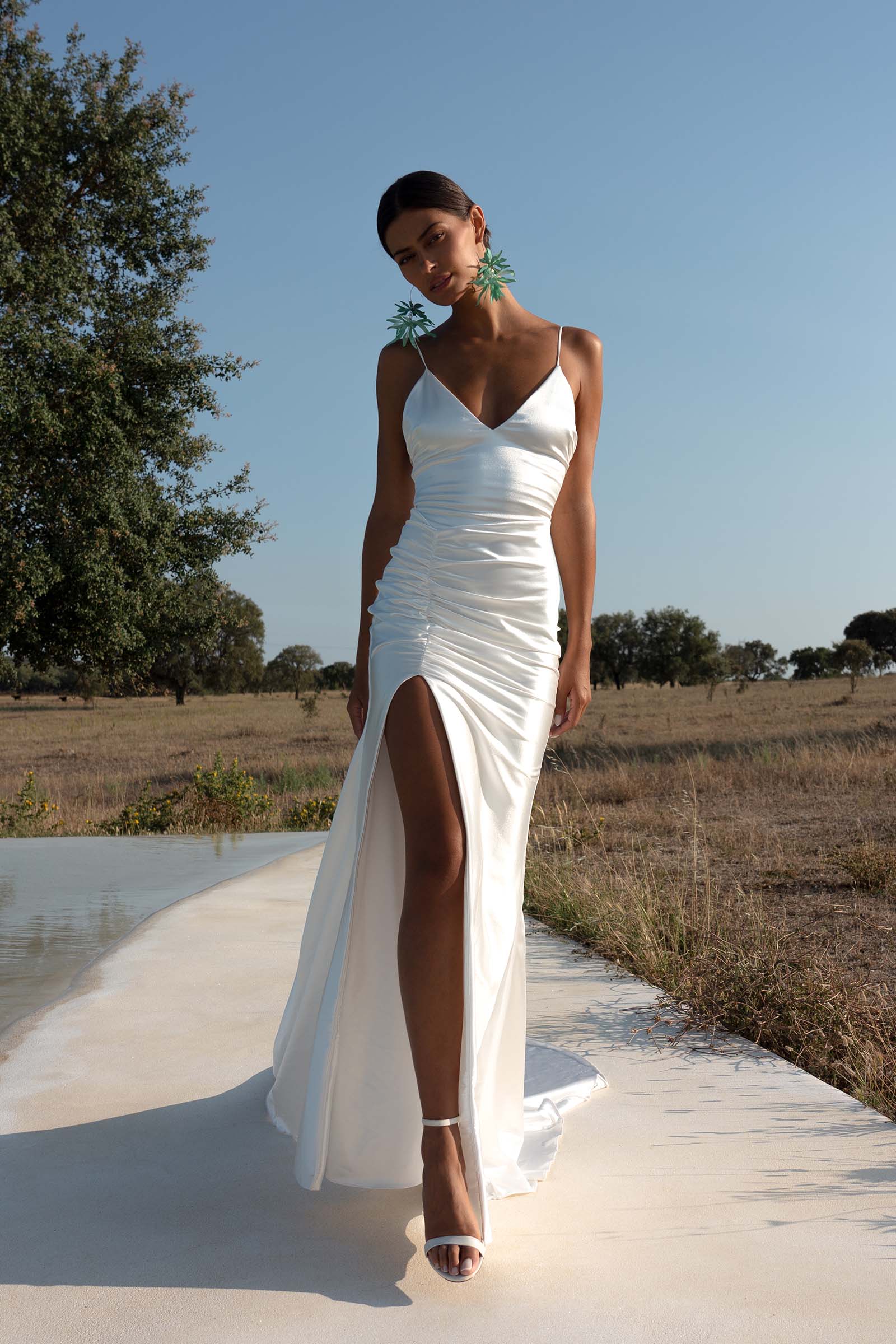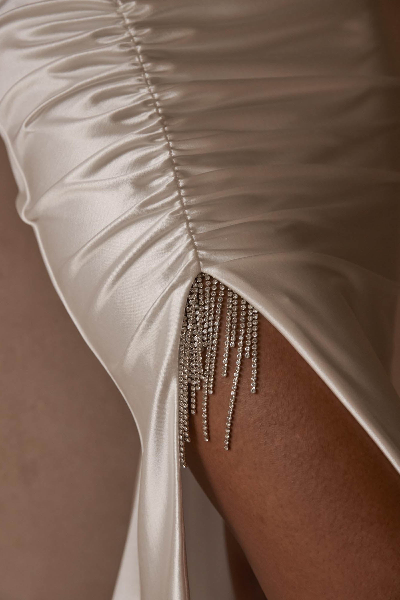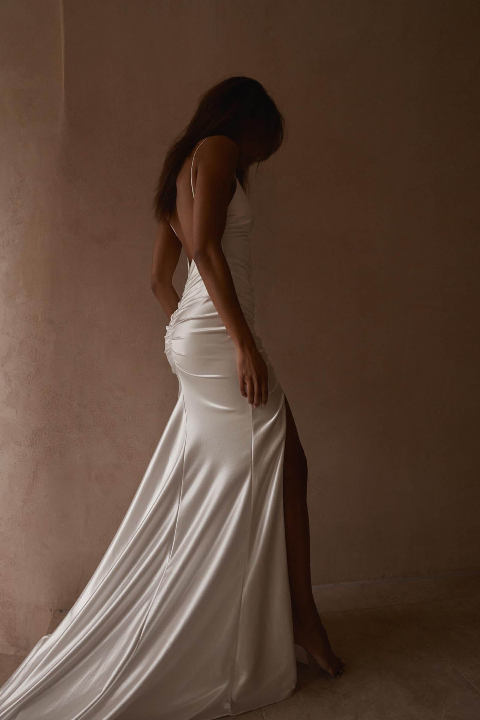 Feminine touches present through detailed rouching, and a daring thigh-high split. This backless wedding dress is pure luxury.